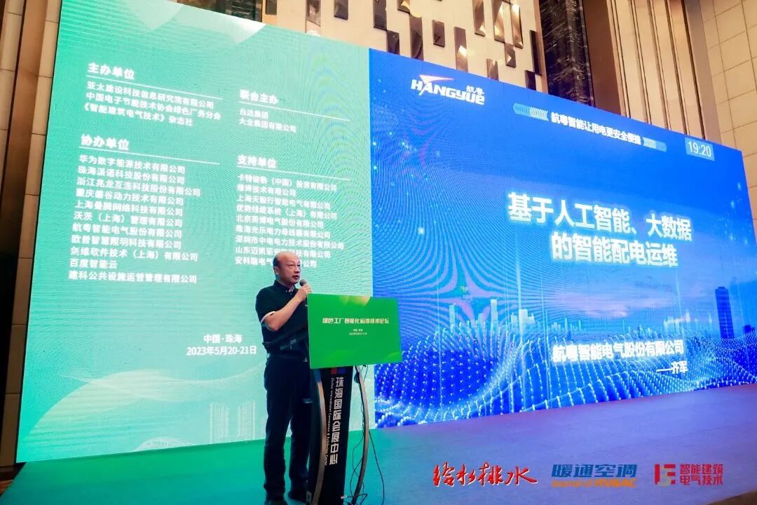 2023年5月20-21日,第六届绿色工厂厂务大会在珠海国际会展中心隆重开展。航粤智能电气股份有限公司高级副总裁、首席技术官齐军受邀作为演讲嘉宾为大家介绍“基于人工智能、大数据的智能配电运维”的技术论坛。