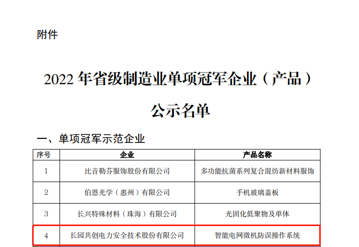 近日,广东省工业和信息化厅公布“2022年省级制造业单项冠军企业(产品)”名单,长园共创电力安全技术股份有限公司(以下简称:长园共创)入选“2022年省级制造业单项冠军示范企业”名单。
