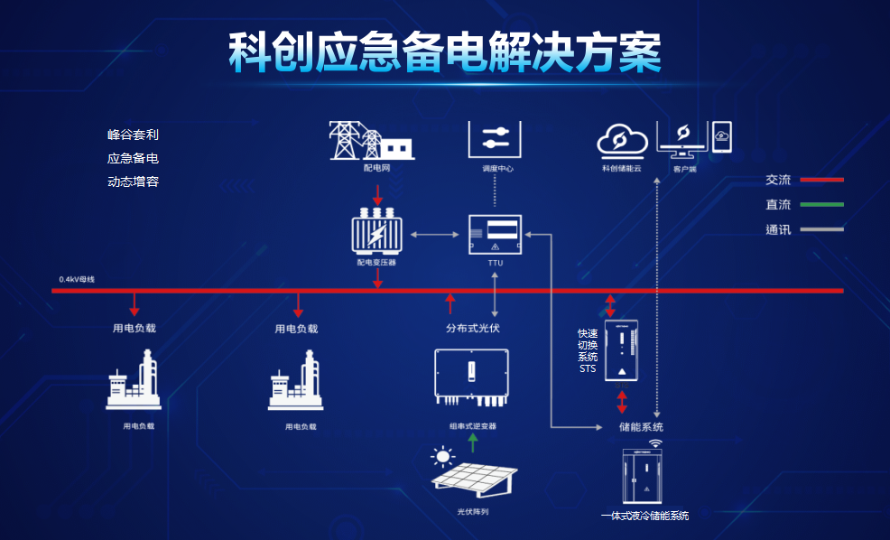 该方案可实现峰谷套利、应急备电、动态增容功能,在突发停电情况下供电,确保关键设备和生产流程不受影响,最大程度减少损失。配合科创自研快速切换系统STS,可实现10毫秒内的并离网无缝切换,可保证绝大多数负荷类型条件下不间断供电,实现无感切换。