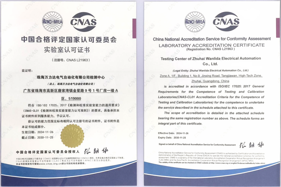 获得CNAS认证,标志着珠海万力达电气自动化有限公司检测中心在硬件设施、管理标准和技术能力等方面全面达到了国家和国际的高标准。这一认证为公司质量管控和技术研发提供了坚实的保障,意味着公司在未来将按照更为严格的国际标准进行全方位的质量控制,确保每一款产品都能达到更高的质量要求。